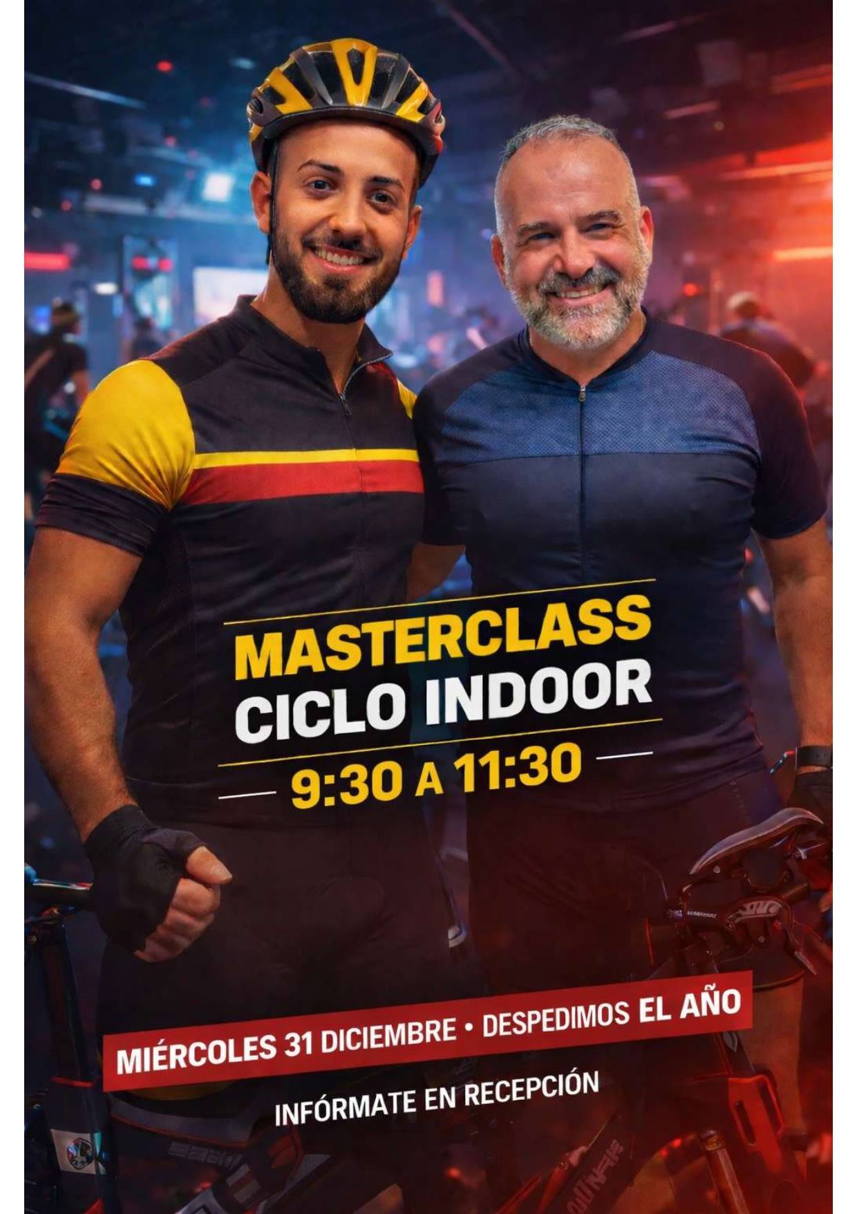 El 31de diciembre tendremos una master class de ciclo indoor a cargo de Manu y Raúl para despedir el año de la mejor forma que sabemos.